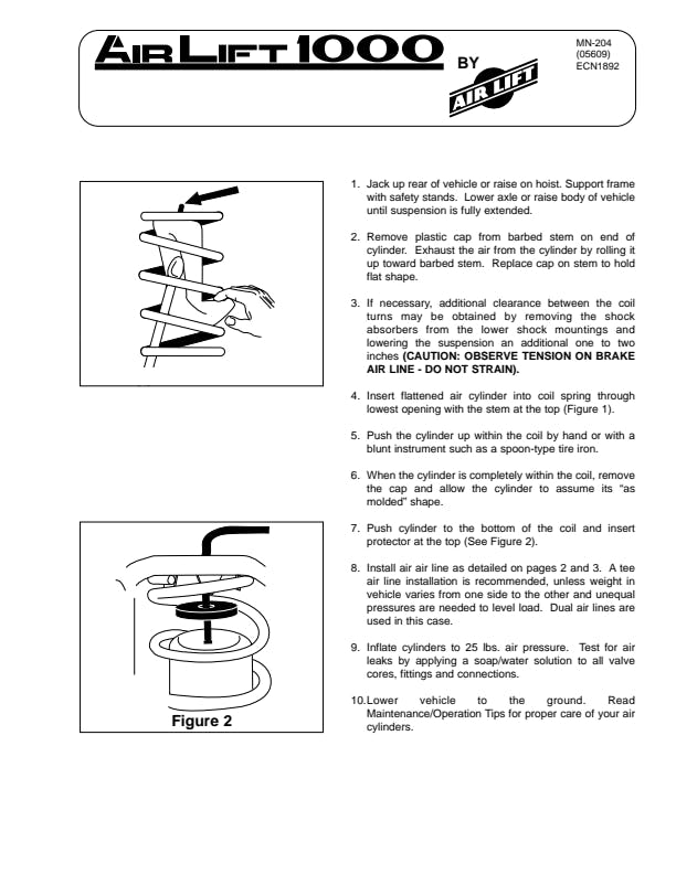 Air Lift adjustable air helper springs level your load, and give your truck, van, or SUV a safer, more comfortable ride. Air springs are easy to install inside the existing coil spring with common mechanic's tools. Just add air when towing or hauling a heavy load, and reduce air pressure when unloaded, they are fully adjustable for a great ride. Air Lift air springs eliminate sag, sway, and bottoming out. They are made with rugged, durable components for long, reliable service. Air Lift 1000 kits fit many popular customer vehicles with coil springs. They're designed to: add support to rear springs on many popular SUVs, replace OEM front air springs on P-30 motor homes, provide front end support for snowplows, winches, etc., improve muscle car traction for drag racing, and improve ride and handling for full-size vans and trucks with front coil springs. Air adjustable with quick connecting, easy-to-use air fittings, Air Lift 1000 air helper springs have a typical max pressure of 35 PSI on cars and SUVs, and 90 PSI on motorhomes. They also have up to 1000 pounds of leveling capacity, right up to the manufacturer's recommended Gross Vehicle Weight Rating. Air Lift 1000 kits also come standard with a limited lifetime warranty and an exclusive 60 day ride satisfaction guarantee.