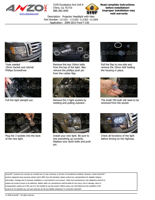 Guaranteed To Improve Your Vehicles Appearance; Rigorously Tested For Fit And Function; Simple Plug And Play; No Modifications Required; 1 Year Warranty Covering Any Manufacturers Defects; Easy Installation Using Common Hand Tools; Uses Stock Mounting Locations And Hardware; D.O.T. Compliant To S.A.E. Standards; Sold As A PairApplication Summary: