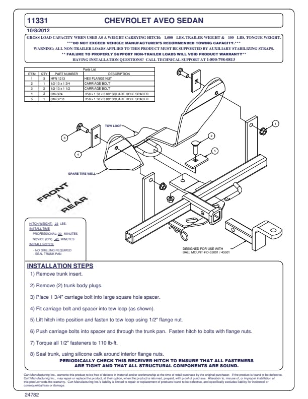 However you define adventure -- whether its climbing onto the back of a mountain bike, hunting from the top of a tree stand or camping with the family a long way from nowhere -- CURT class 1 hitches provide a light-duty towing receiver to help you Bring It. Each is made to fit a specific vehicle, providing easier installation, a better fit and optimal towing capacity. Custom class 1 trailer hitches are available for a variety of smaller vehicle types, including the compact car, crossover, minivan and small SUV. This particular class 1 hitch is designed to be a custom hitch for certain years of the Chevy Aveo (to verify vehicle compatibility, see the CURT application guide at curtmfg.com). Tested in accordance with SAE J684, it offers a weight carrying capacity of 2,000 lbs. GTW and 200 lbs. TW. It is equipped with 1-1/4 in. receiver tube opening to accept a ball mount shank or other hitch mount. This class 1 hitch also comes with all necessary mounting hardware. With its lightweight design and smaller receiver tube size, a class 1 hitch is especially useful for adding cargo space with a hitch-mounted bike rack or cargo carrier. They can also typically be used to tow small trailers such as a utility trailer, kayak trailer or teardrop camper (never exceed the lowest weight capacity of any towing component; i.e. the vehicle, hitch, trailer, etc). Though CURT class 1 trailer hitches are only intended for light-duty towing, we apply the same principles of quality as we do to the rest of our rear mount hitches. Each class 1 hitch is made with hands-on engineering, high-strength steel and precise welding. We use a co-cured finish of liquid A-coat, inside and out, and durable black powder coat to provide a lasting defense against rust, chips and UV rays.