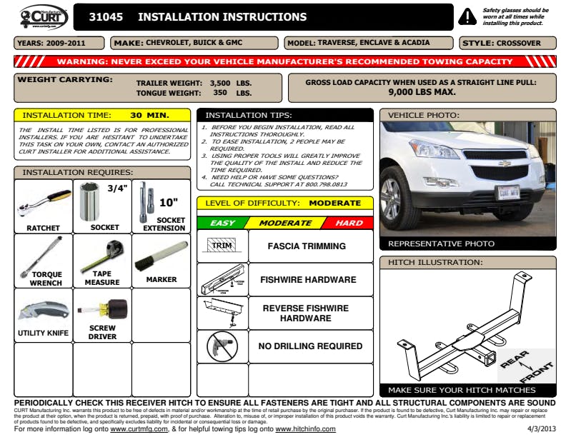 2 Front Receiver Hitch, Select Buick Enclave, Chevrolet Traverse, GMC Acadia; Rated to 3,500 lbs. gross trailer weight and 350 lbs. tongue weight; Compatible with a tow hook or shackle mount (9,000 lbs. straight-line pull); Made with a vehicle-specific design for a custom fit; Provides a convenient mount for hitch accessories; Ideal for attaching a snow plow, cargo carrier or other front hitch mount; Allows for easy maneuvering of a trailer into a tight spot; Tested for safety in accordance with SAE J684; Precisely welded for superior strength and fit; Protected by a durable black powder coat finish; Co-cured in a rust-resistant liquid A-coat, inside and out; Equipped with an open-back receiver for easy cleaning; Limited lifetime warranty (one-year finish, one-year parts); Made in USA (may include imported hardware)Application Summary: