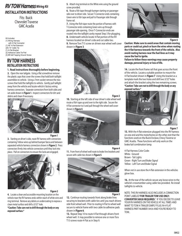 Towing your vehicle behind your RV is a great way to experience more of the adventure on your cross-country excursions. Whether you're towing a compact car or a full-size truck, CURT has the perfect solution to help you Bring It! CURT towed-vehicle RV harnesses are a vehicle-specific, plug-and-play solution to wiring your vehicle for dinghy towing. They use original-equipment-compatible connectors to plug into your vehicle's wiring system without any cutting, splicing or soldering required. They provide a standard 4-way flat connector to plug into the RV socket and synchronize the vehicle's tail lights, turn signals and brake lights with the RV's. Because each towed-vehicle RV harness has a vehicle-specific design, installation is fast and easy. This particular RV dinghy towing wiring harness is designed for specific years of the Chevrolet Traverse. CURT RV harnesses are also built to provide long-lasting operation. They feature integrated block diodes that protect the vehicle's circuits from the RV signals. They isolate the sensitive vehicle electronics, keeping them from overheating and short circuiting. Every CURT towed-vehicle RV harness comes ready to install with all necessary hardware included. They also come with a 4-way flat extension to provide plenty of length to plug into the RV socket, as well as a connector mounting bracket to mount the connector on the vehicle.