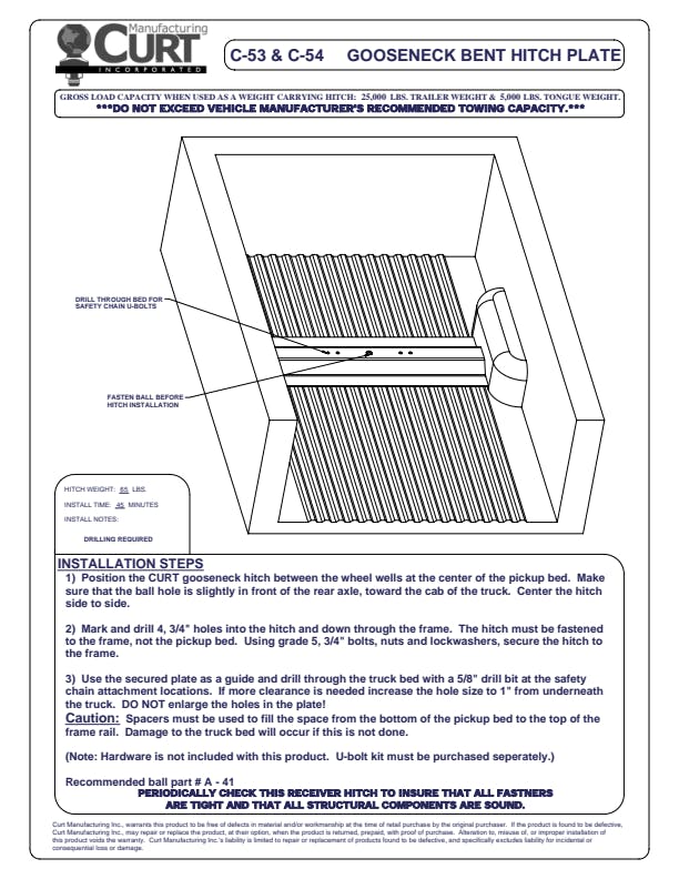 CURT fixed ball gooseneck hitches are built to deliver all the towing power you need to tackle the demands of the job, without breaking the bank. When your day starts the moment you climb into the seat of that full-size 4x4 pickup, your towing equipment needs to be a reliable extension of your truck. This fixed ball gooseneck hitch features a basic bent-plate design for versatile installation in a variety of pickup trucks. The plate measures 2-1/2 tall, 18-1/4 deep and 48 wide and offers a 1-1/4 trailer ball hole to accept a heavy-duty gooseneck ball. It also features a maximum gross trailer weight capacity of 25,000 lbs. to accommodate a variety of trailers, including flatbeds, livestock trailers, horse trailers and more (NOTE: Never exceed the lowest weight capacity of any towing component; i.e. the vehicle, hitch, trailer, etc). This fixed ball gooseneck hitch also has pre-drilled holes to accept safety chain loops and comes with a tough carbide powder coat finish for long-lasting rust resistance. Installation of the bent-plate gooseneck hitch requires over-bed gooseneck installation brackets. It also requires some drilling and must be mounted onto the frame of the truck, slightly forward of the rear axle.