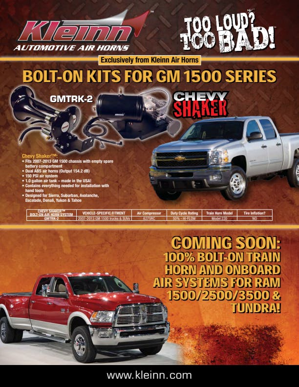 The Chevy Shaker(TM) produces an incredible loud 154.2 dB train horn sound and bolts directly onto 2007 to 2013 Chevrolet/GMC half-ton trucks and SUVs. This ready-to-install, 100% bolt-on kit comes with a powder-coated, custom fit, USA-made steel mounting plate and air tank that are pre-assembled with a complete high performance 150 PSI air system. The system simple drops in and bolts into factory holes in the empty second battery position in your truck or SUV engine compartment. Bolt the horns onto the existing holes on the driver's side frame, make two plug-in connections, connect the air line and you're done! The Chevy Shaker(TM) comes with everything needed for a flawless installation.