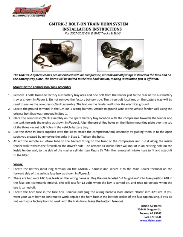 Fully Function Train Horn System; Quick And Easy Installation; Comes In One Box; Ready To Make Insane Sound; Components Are PreMounted; Proprietary Mounting Plate Bolts To Spare Battery Location; Dual Solenoid Valves For Maximum Volume; Mounts To Driver Side Tow Hook Area; Two Bolts Using Custom Manufactured Steel Bracket; Thermally Protected Air Compressor Creates CFM @ 0 PSI; Uses Factory Horn Button Located Righted On Steering WheelApplication Summary: